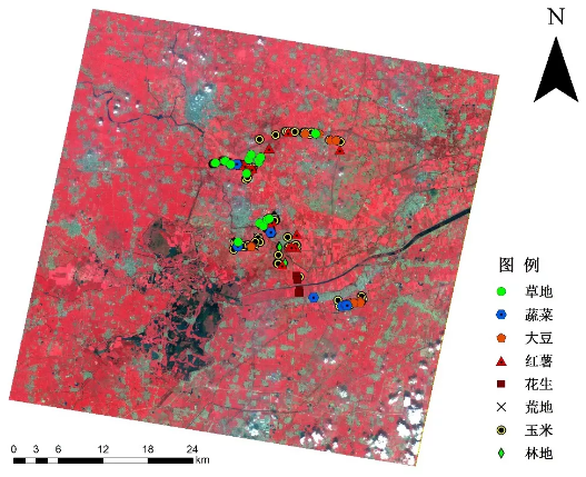 本次的案例我們采用“珠海一號”高光譜衛(wèi)星OHS-2(貴陽一號)的影像——河北雄安新區(qū),作為實驗區(qū)域。高光譜遙感影像數(shù)據(jù)經(jīng)過輻射定標,并在定標結(jié)果的基礎(chǔ)上進行了FLAASH大氣校正。為了實驗的準確性,我們還對研究區(qū)域進行實地調(diào)查,調(diào)查樣點如圖1所示。